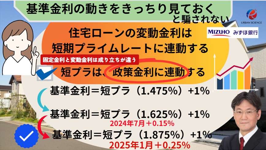 ※みずほ銀行だけ2025年1月の利上げが基準金利に反映されておりませんでした。2025年10月より基準金利に反映され、適用金利が0.775%に引き上げられました。他の銀行は、2025年4月に基準金利を引き上げましたが、みずほ銀行だけ半年遅れで基準金利を引き上げました。基準金利の動きをしっかり見ておくことで、0.525%の実質金利は0.775%であることを見抜くことができます。
