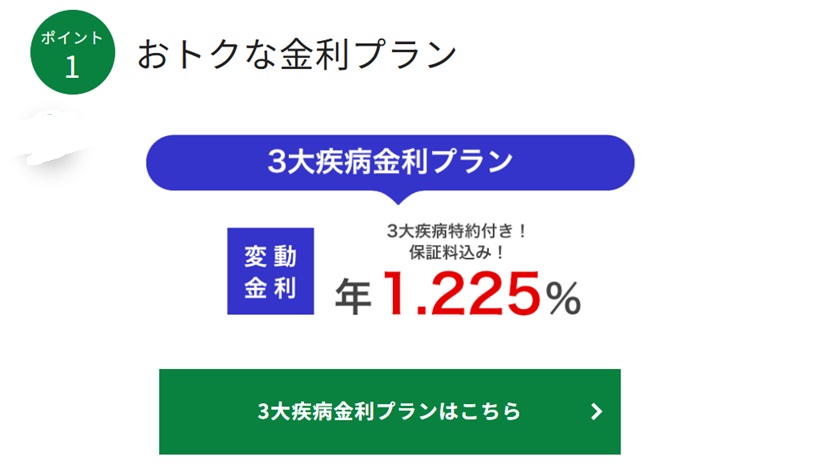 2026年4月、3大疾病付き保証料込みの1.225%のキャンペーンを行っております。3大疾病の中にガンも含まれています。以前は3大疾病の場合、完済年齢が、75歳6ヶ月まで使いにくい商品でしたが、現在最終ご返済時のご年齢が満80歳未満の方が条件となっており使いやすくなっています。80歳完済になったことが大きな違いです。