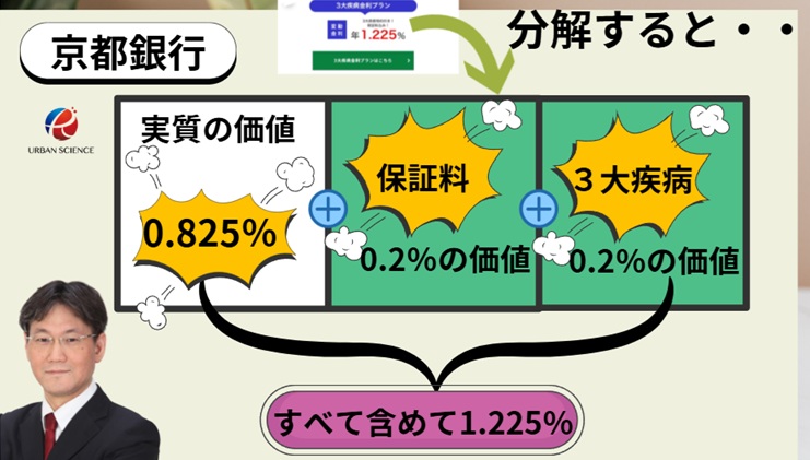 2022年10月から3大疾病のキャンペーンを行っており、3大疾病に力を入れています。2026年4月からは、保証料込み・3大疾病込みで、変動金利1.225%で提供しております。一見すると、高い金利にみえてしまいますが、コストはすべて含めて実質金利で考えないといけません。保証料込みなので金利的価値に換算すると、0.2%相当、3大疾病は、金利的価値に換算すると、0.2%相当となります。そう考えると実質金利は、1.225%から0.4%を差し引いた0.825%となります。