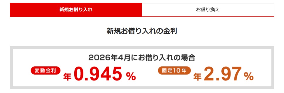 最優遇金利の場合、変動金利0.945%で住宅ローンが組めます。(2026年4月)