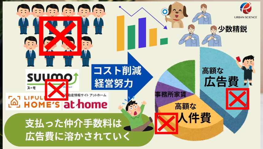 ★多くの不動産会社にとっては、仲介手数料だけの収入に対し、広告費や人件費という膨大な支出があるために仲介手数料無料サービスが困難なのです。