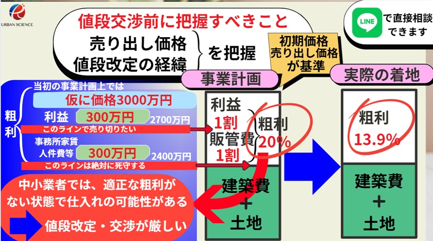 中小業者の場合、利幅がほとんどなく粗利1割くらいでも、土地仕入れしているケースがあります。コスト競争力がない業者の場合、仕方なく仕入れするしかありませんが、その場合、値引きに対応する余力はなくそもそも値引き交渉に応じてくれない可能性があります。販管費を考えると、利益がでるのかでないのかわからないレベルです。どんな事業でも粗利20%を切ると経営的には苦しいのが一般的です。この粗利から社員の給料や事務所の家賃等を支払います。